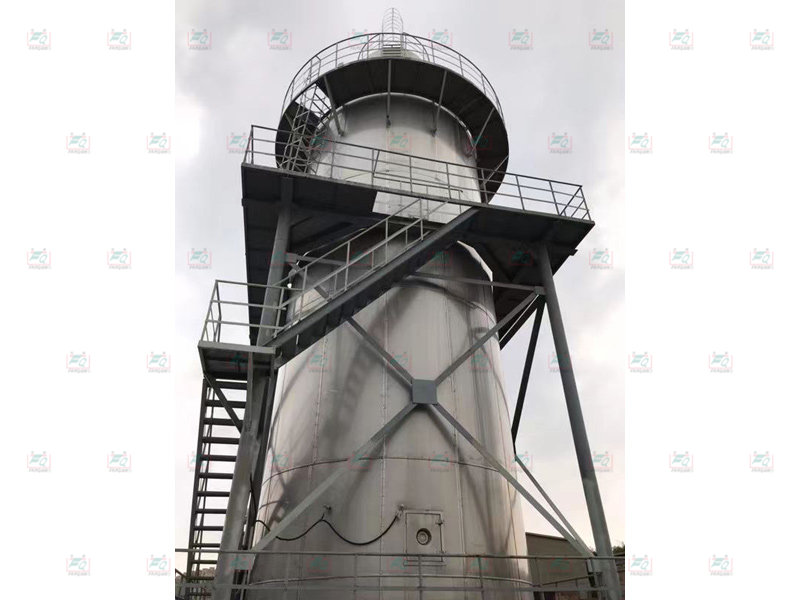 本机组工作过程为料液通过隔膜泵高压输入,喷出雾状液滴,然后同热空气并流下降,大部分粉粒由塔底排料口收集,废气及其微小粉末经旋风分离器分离,废气由抽风机排出,粉末由设在旋风分离器下端的授粉筒收集,风机出口还可装备二级除尘装置,回收率在96-98%以上。